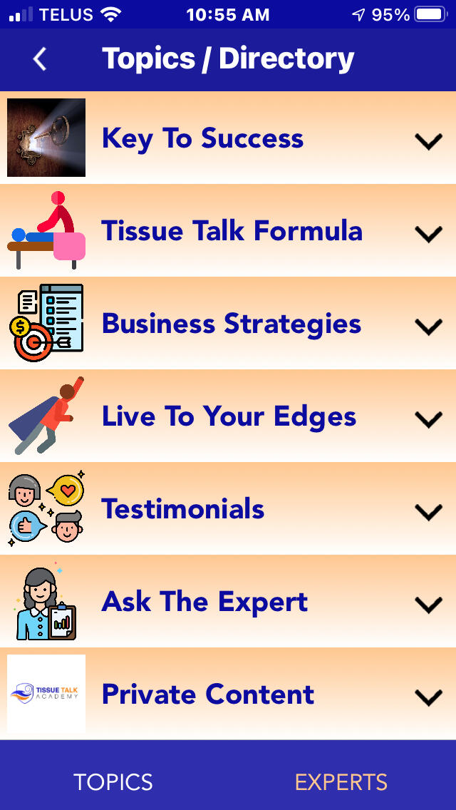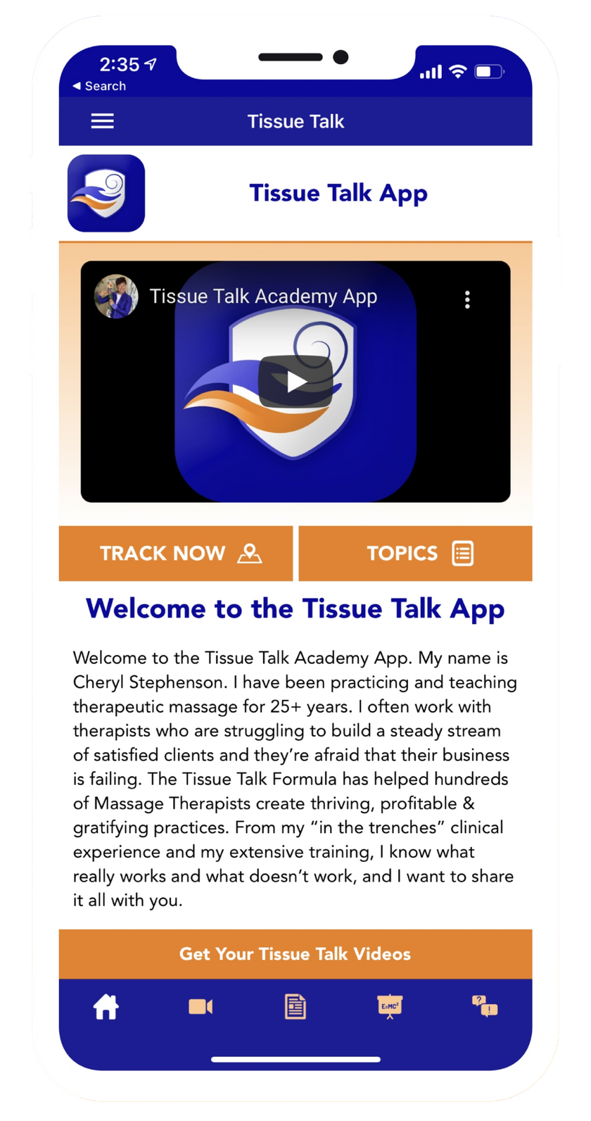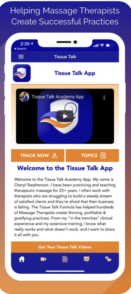 Welcome to Tissue Talk Canada. Do you struggle with building a steady stream of satisfied clients and making the income you thought you would? Would you like to become the soft tissue pain relief specialist clients are lining up to see?Applying the teachings you will find in this app will help you elevate your ability to provide effective, longer lasting pain relief solutions for your clients. The content is based upon the TISSUE TALK FORMULA.INTELLIGENT TREATMENT + INTUITIVE TOUCH = MAGIC HANDSWatch videos, read blogs and articles, and create a private journal that will keep you inspired. Come back often and make sure you look for the special offers and the in-person and virtual events hosted by Tissue Talk.Don't forget to check out the Tissue Talk Academy. This is a private membership library that teaches therapists how to embrace massage therapy as an "art and a science". It's in the perfect balance of both, where you will discover your magic hands, or what Cheryl calls Tissue Talk Hands.