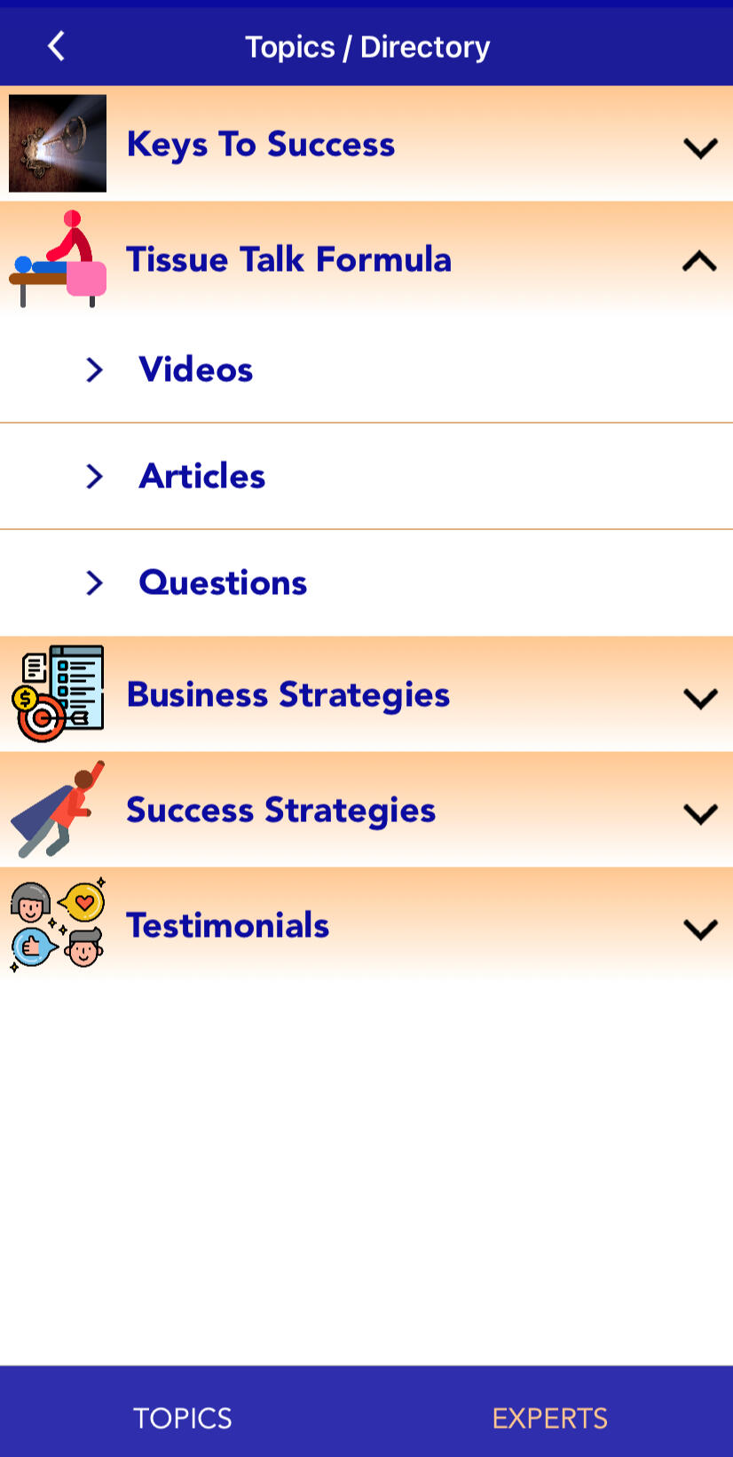 TissueTalk is an app focused on helping massage therapists position themselves as the "go-to-expert" and fill their appointment books with ease. The app contains content from the creator, Cheryl Stephenson, content sourced online on a variety of massage therapy topics and content from experts we invite to contribute to our app.This is where you come in as an expert on a topic related to the vision of this app. We'd like to spotlight you in our directory, under a topic that fits your message, business or product. We offer two options for being in our app with varying exposure. One is totally free and one is a low cost monthly fee. To learn about these options and to add your message/business, click the button below.